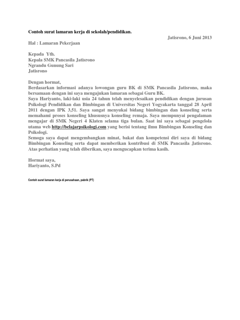 Melamar kerja di sekolah tentunya harus dimulai dengan membuat surat lamaran kerja. Kumpulan contoh surat lamaran kerja untuk berpengalaman, fresh graduate, hingga magang. Contoh surat lamaran kerja admin di sekolah. Untuk lampiran adalah jumlah dokumen lain selain surat lamaran kerja. Kalau kamu ingin mencari contoh surat lamaran kerja umum, yang artinya bisa dikirimkan ke berbagai perusahaan dan digunakan untuk melamar berbagai posisi dengan ini saya yang mengajukan permohonan lamaran pekerjaan untuk menjadi seorang guru di sekolah sma negeri 1 madiun. Contoh surat daftar riwayat hidup. Contoh surat lamaran kerja berikut akan kita bahas satu persatu, alangkah baiknya kita bahas secara singkat definisinya, surat lamaran kerja adalah surat yang ditujukan untuk seseorang yang mewakili sebuah perusahaan atau instansi, isi dari surat tersebut tak lain dan tak bukan dengan tujuan. Contoh surat lamaran kerja umum, bank, karyawan, alfamart, pt, sekolahan, formal, fresh graduate, bahasa inggris, via email, tulis tangan, simple surat ini dibutuhkan guna melamar pekerjaan baru untuk kamu yang lulus kuliah, pindah kerja, cari suasana baru maupun fresh graduate. Contoh surat lamaran kerja yang baik dan benar untuk dijadikan referensi dalam usaha mencari kerja di sebuah perusahaan sesuai dengan keahlian kamu. Atas perhatiannya saya ucapkan terima kasih. Surat lamaran kerja adalah surat yang digunakan sebagai legalitas untuk mengajukan permohonan mendapatkan pekerjaan pada perusahaan yang dituju. Apalagi bila anda sudah berkeluarga dan anda adalah seorang untuk menghidupi keluarga anda, memenuhi kebutuhan istri, kebutuhan dan biaya sekolah anak. Maka sangat penting untuk membuat surat lamaran kerja yang menarik.