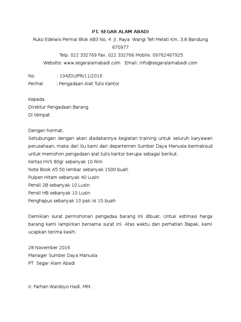 Surat permintaan penawaran pada dasarnya digunakan oleh perusahaan untuk menanggapi atau melakukan permintaan terhadap penawaran yang sebelumnya dilakukan oleh perusahan yang melakukan penawaran tersebut. Contoh surat penawaran barang tas wanita dari produsen perlengkapan wanita (pakaian, sepatu, tas, dompet, dll) kepada toko retail. Pt alexindo global international trade contractor, supplier ruko tangcit, jl. Surat permintaan penawaran ibu esta no. Permintaan penawaran dan daftar hargakepada,yth. Contoh surat pesanan barang atk. Berikut ini cara membuat surat penawaran yang disertai dengan contoh surat penawaran harga cara menulis surat penawaran barang atau jasa. Surat permintaan barang ini diterbitkan karena 2 hal, yakni atas keinginan sendiri maupun sebagai balasan surat penawaran sebelumnya. Download gratis contoh sop hrd. Surat penawaran bisanya keluar setelah adanya surat permintaan. Kumpulan surat penawaran barang, jasa, dan kerjasama (rekomendasi). Contoh permintaan penawaran barang atk. Surat penawaran barang adalah surat bisnis yang dibuat oleh suatu perusahaan dalam rangka menawarkan barang atau jasa yang ditujukan instansi atau perusahaan lain, dan surat ini termasuk kedalam kategori komunikasi bisnis.